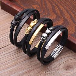 Punk Style Men's Skull Leather Bracelet Multi-Layer Braided with Stainless Steel Magnetic Clasp Fashion Jewelry Charm